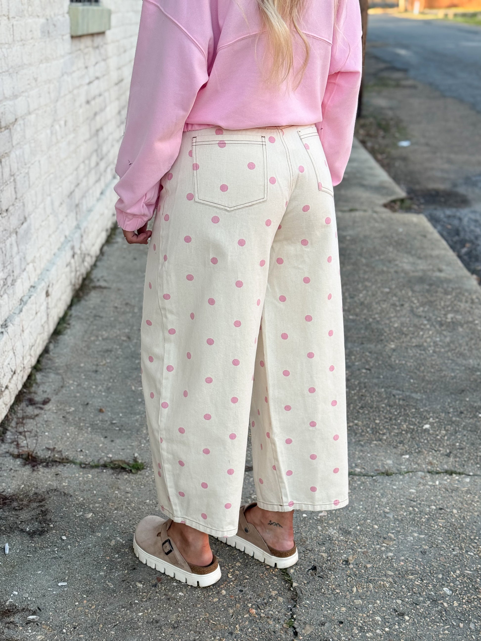 Get ready to frolic into spring with the Pretty Moment Polka Dot Barrel Jean! Dressed in playful pink polka dots, these jeans are cuter than a puppy in a bowtie. They’re perfect for turning your everyday stroll into a runway strut. Who knew denim could be this much fun?
