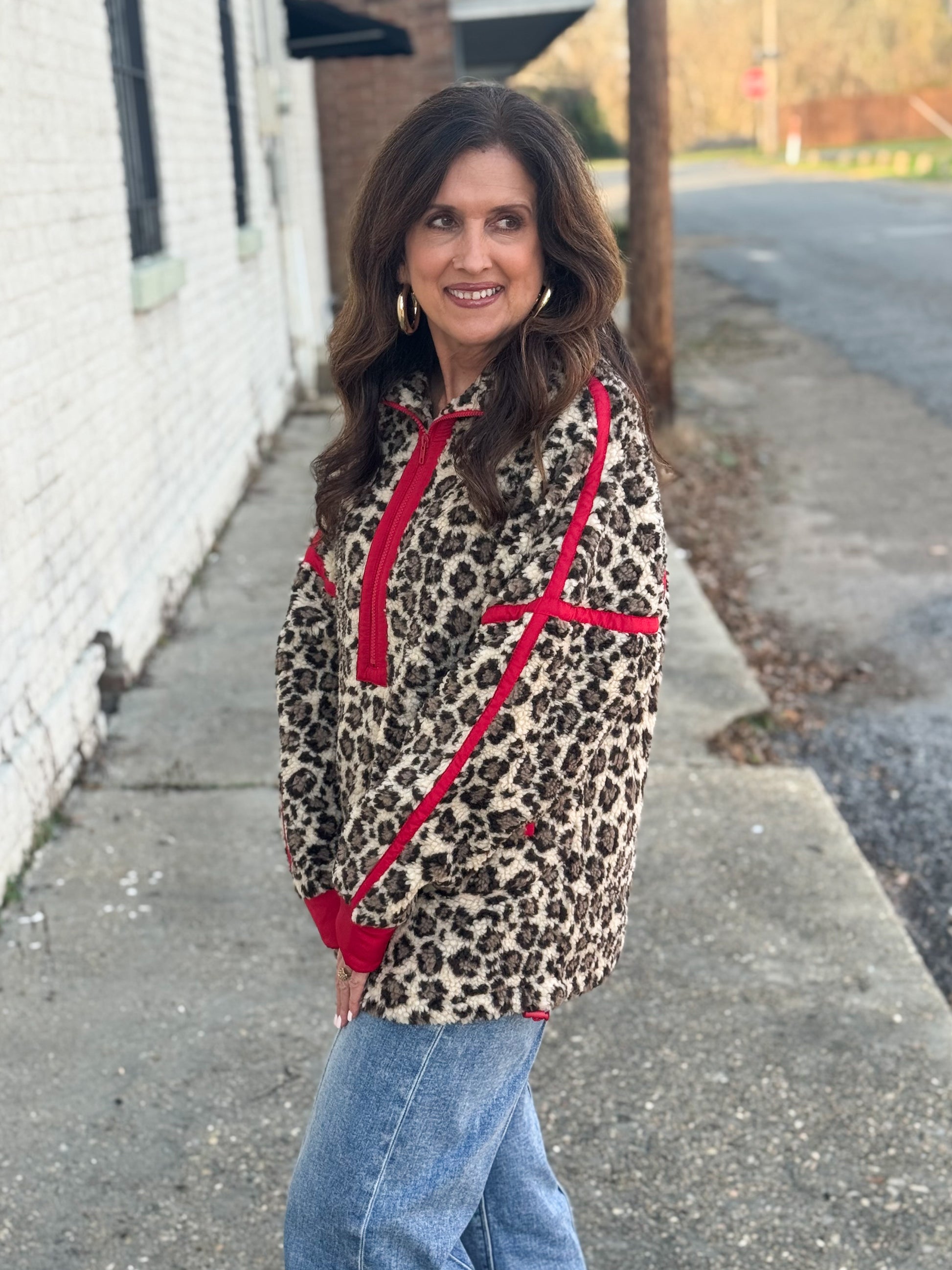 Elevate your wardrobe with the Wild For You Pullover! Featuring a trendy half-zip design and bold leopard print with striking red details, this pullover combines comfort with standout style.